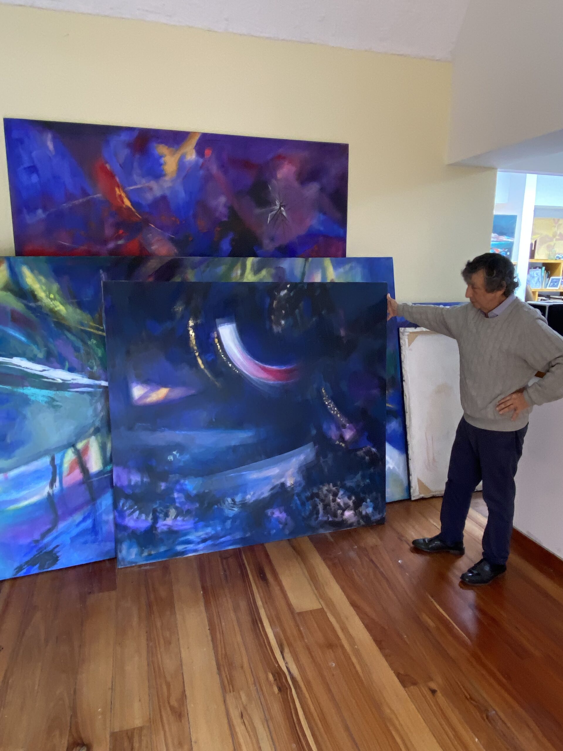 - Algunas obras del Maestro nariñense Manuel Guerrero Mora: el Maestro en su taller en abril 2024, un cuadro de la serie Trópico, un cuadro de la serie Sur, un cuadro de la serie Fractales,